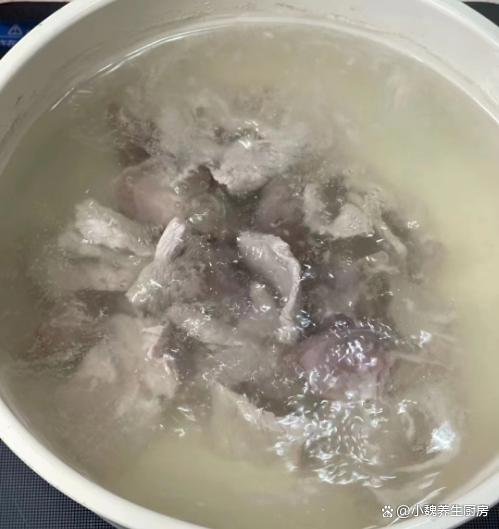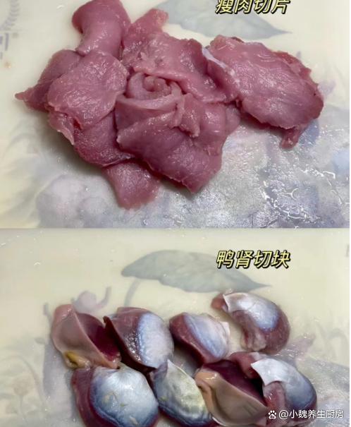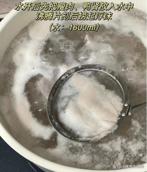 3:鍋中放入鴨腎和瘦肉片,加上冷水足量,加上料酒和姜片,將其焯水幾分鐘,逼出里面的血腥味,洗凈用溫水沖洗干凈,備用。