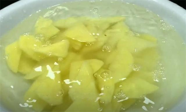 1.首先把去好皮的土豆從中間切開,一分為二,然后斜刀從中間切開,再把土豆改刀切成厚一點的片,厚度和一塊錢硬幣差不多就可以,全部切好后,咱們把土豆片放入清水中,防止氧化變黑。