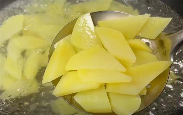5.接下來鍋中燒上水,加入一勺食鹽,用勺子把食鹽攪勻化開,水開后把土豆片放入鍋中,咱們把土豆片焯水1分鐘左右,這樣可以縮短炒制的時間,焯燙好之后,用漏勺撈出來控干水分。