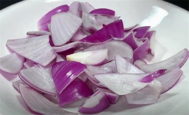 2.再準(zhǔn)備一個去好皮的洋蔥,從中間切開,然后把洋蔥改刀切成小塊,全部切好后,再用手將它抖散,處理好之后,先裝在盤中備用。