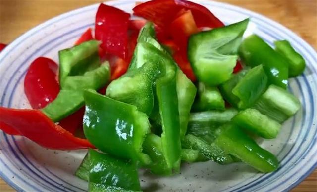 3.接下來準(zhǔn)備青紅辣椒各一條,切掉辣椒的把,從中間片開,取出里面的辣椒籽,去籽后把辣椒改刀切成菱形片,全部切好后裝在盤中備用。