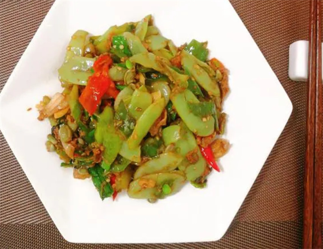 將扁豆制作成美味的扁豆炒油渣,將扁豆的清香與豬油渣的濃香巧妙地融合在一起,創造出一道既香辣誘人又富有營養的下飯佳肴。 一、制作步驟: 1. 將扁豆清洗干凈,去掉莖部,使其保持干燥。隨后,用手輕輕壓扁豆,使其微微開裂,有助于入味。備用。 2. 將青紅椒切成片,生姜切絲,大蒜切末,香菜切段備用。 3. 將炸過油的油渣備用。 4. 在鍋中倒入適量油,加熱后放入油渣,翻炒1分鐘。加入青紅椒、蒜子,一同翻炒2分鐘。選擇不同顏色的椒主要是為了增加視覺上的層次感,但如果只有一種顏色的辣椒,同樣可以制作。 5. 將準備好的扁豆倒入鍋中,翻炒3分鐘。等到扁豆表面微微起褶皺,使其香味與扁豆的香味充分融合。加入一些清水,大火煮沸2分鐘,確保扁豆煮熟。加入鹽、生抽、醬油、蠔油調味,翻炒均勻即可出鍋。