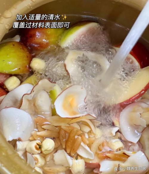 5:準備好砂鍋燉湯(洗干凈),放入焯水好的排骨,放入無花果和蘋果,放入蓮子,海底椰,百合和其他食材,加上足量冷水,調到大火燉35分鐘,中途可以舀掉一層油膩的物質。