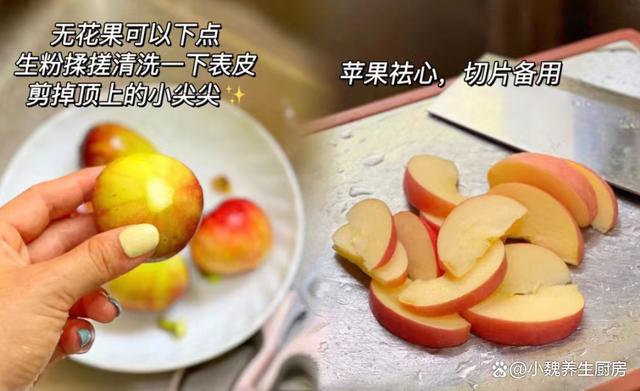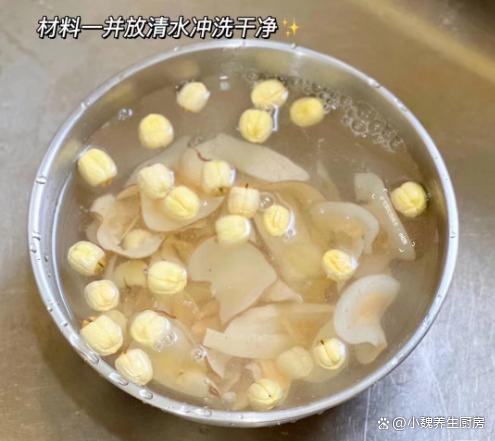 2:提前把蘋果外皮洗干凈,從中間切開,去核切成塊狀,白蓮子提前泡2個小時,還要去掉蓮子心,備用。