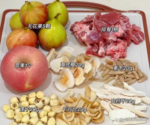 食材清單:選購新鮮無花果5個,選購350克優質肋排(肋排屬于排骨的種類之一,排骨的肉質鮮嫩,排骨可以搭配很多食材,煲湯是南方人的最愛,湯汁十分鮮美,好喝又解膩),海底椰20克,麥冬20克左右,少許食鹽,一個大蘋果,20克白蓮子,百合20克,適量料酒,少許白胡椒粉,冷水和純凈水若干,姜片若干,香蔥少許,其他調味品。