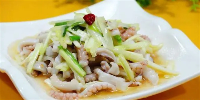 三、油嗆腰片 食材:豬腰、大蔥、大蒜、生抽、辣椒、水 制作方法: 1. 準備腰子,去膜,切片,焯水后備用。 2. 準備調味汁,混合生抽、鹽、糖,熱油,拌勻。 3. 腰片墊盤,撒蔥段、辣椒,淋上調味汁和熱油。 四、韭黃炒八爪魚 食材:八爪魚、韭黃、紅干椒、生姜、小蔥、鹽、香油、淀粉 制作方法: 1. 清洗八爪魚,切塊,焯水。 2. 準備醬汁,混合香油、生抽、鹽、糖、淀粉。 3. 熱鍋炒香蔥姜,加入韭黃、紅椒,加入八爪魚翻炒。 4. 倒入醬汁,炒至濃稠。