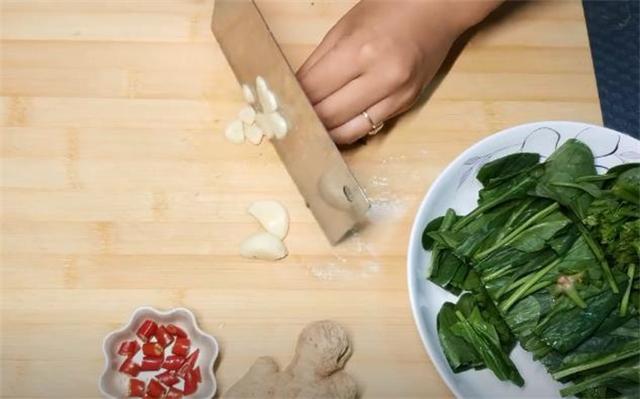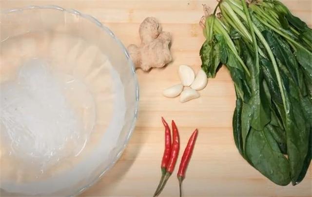 1.準備的食材有粉絲、菠菜、小米辣、大蒜、生姜,粉絲需要提前泡軟,咱們用熱水燙一下。