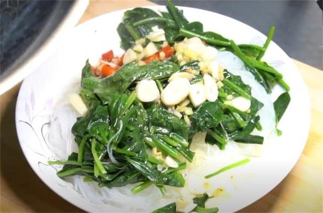 5.撈出的菠菜控干水分,擱置一邊,把咱們剛才泡好的粉絲放到盤子里,再倒上剛才切好的小米辣、蒜末和姜末,鍋內事先熱好油,然后淋在上面。