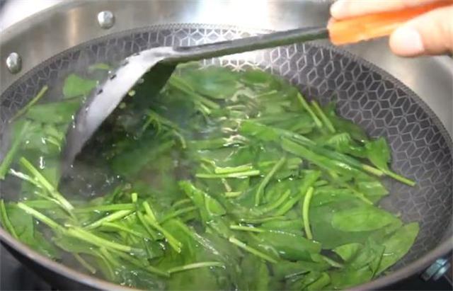 4.鍋內倒入適量冷水,現在水開了,咱們把切好的菠菜放進去燙一下,然后再放少許食用油和食鹽,攪拌一下,菠菜斷生后撈出來就行了。