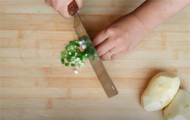 1.準備的食材有土豆、豆角、小蔥,現在咱們先處理一下小蔥,沖洗干凈,然后切成蔥末。