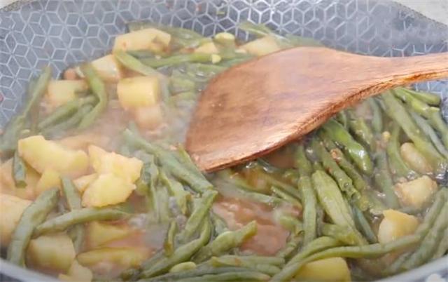 4.鍋內倒入適量食用油,先把蔥花炒一下,炒出香味之后,放上幾大勺豆瓣醬,等醬炒出香味后,咱們把豆角放進去炒一下,讓每一根豆角都裹上醬汁,翻炒一會兒,最后咱們再把土豆放進去,加入適量清水,稍微沒過土豆和豆角就行了,蓋上蓋子開中火燉上15分鐘左右就差不多了,開鍋后嘗嘗味道,如果不咸的話可以適量的加些生抽,想吃辣的就加些辣椒面。