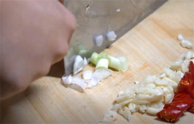 2.然后把小米辣切成比較小的丁,不喜歡吃辣的可以不放這個(gè),大蒜先拍扁,這樣方便切成蒜末,大蔥我們給它切成蔥末。