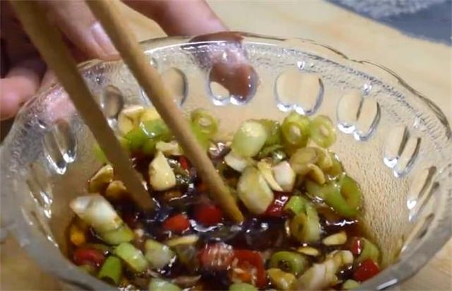 3.把切好的蔥、大蒜還有小米辣都放到碗里邊,現(xiàn)在咱們把食材都準(zhǔn)備好了,我們調(diào)一下料汁,加上一勺鹽,再加一勺糖,淋上點(diǎn)香油,最后再倒入適量的生抽,攪拌均勻就行了。