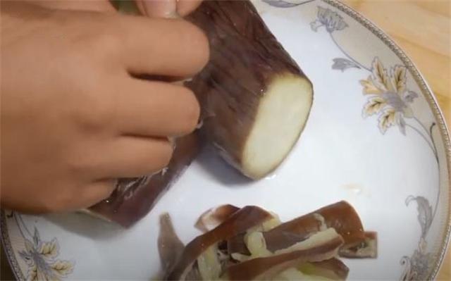 5.蒸好的茄子軟軟的,給它撕成長(zhǎng)條,如果太熱的話就晾一下再撕。
