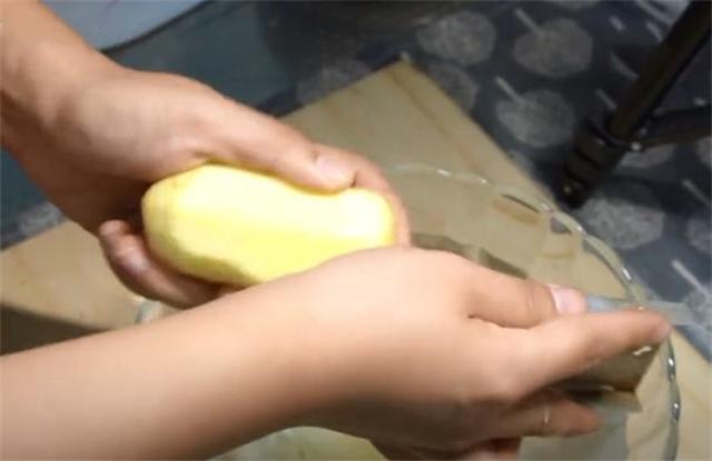 1.我們先準備這幾個食材,土豆和素火腿腸,先給土豆削皮,把土豆擦成絲,擦成絲之后放到清水里先泡著。