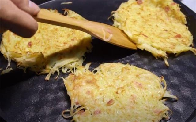 4.電餅鐺刷上一層油,把土豆餡放進去,用筷子或者鏟子壓成圓形,等煎到一面金黃后,咱們換個面繼續煎,煎一會兒盛出來就行了。
