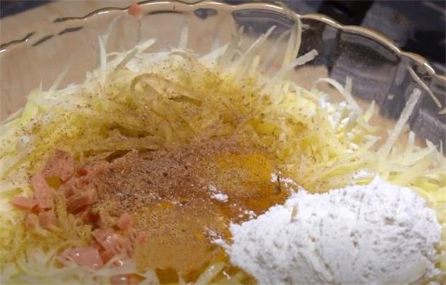 3.土豆絲也泡的差不多了,去掉多余水分,咱們把切好的火腿腸放進去,放兩勺鹽,撒點五香粉和椒鹽,沒有椒鹽不放也行,再倒少許面粉,面粉不要放太多,影響口感,這時候攪拌均勻就行了。