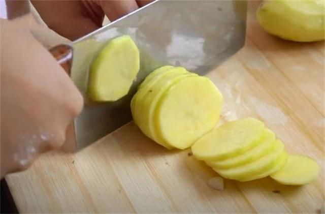 1.先準備三個土豆,適量大蒜,首先把大蒜切成小瓣,把土豆切成片,土豆片不要切的太薄,一會兒燙的時候太薄了容易爛掉。