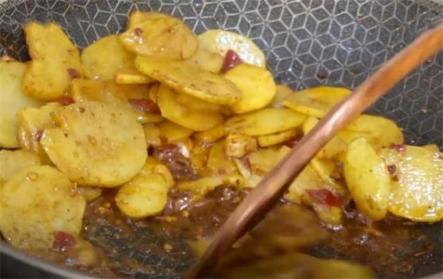4.現在鍋里還有剛才煎土豆剩的油,把蒜瓣放進去炒一下香味,再放兩勺郫縣豆瓣醬,給它翻炒均勻,郫縣豆瓣醬炒出紅油,我們把土豆片放進去,讓土豆片都裹上醬汁,然后加上點五香粉,再加少許椒鹽,沒有椒鹽不放也行,翻炒均勻后就能出鍋了。www.ws46.com