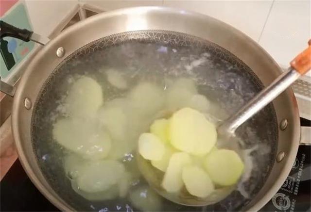 2.現在水燒開了,把土豆片放進熱水里煮上半分鐘,土豆現在已經燙好了,咱們把它瀝干水分撈出來。
