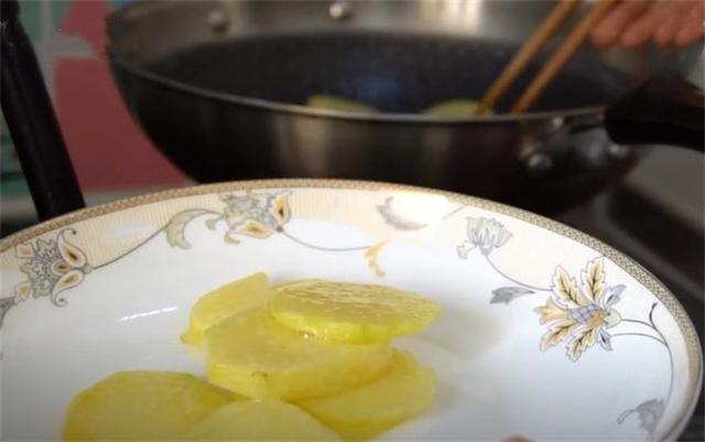3.鍋里準備適量食用油,咱們煎一下燙好的土豆片,煎到土豆稍微有點金黃后就行了,控控油撈出來。