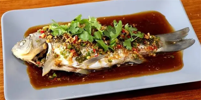 三、檸檬涼拌大蝦 1、食材: 大蝦、百香果、檸檬、小米椒、青尖椒、大蒜、生抽、糖、醋、鹽。 2、制作方法: 清洗大蝦,剪去蝦須,花刀腌制后煮熟。切好青紅椒、大蒜、檸檬,準備調味汁。調味汁加入百香果果肉、青紅椒圈和大蒜片,攪拌均勻。蝦滑淋上調味汁,拌勻,上面放上檸檬片。 四、涼拌鯽魚 1、食材: 鯽魚、蔥姜蒜、小米椒、青尖椒、香菜、生抽、鹽、香油、糖、泡椒水。 2、制作方法: 鯽魚清洗,腌制后蒸熟,撒上香菜段。熱油炒香大蒜,蒸好的魚放上姜片,大火蒸熟。準備調味汁,加入辣椒末、鹽,腌制后加入泡椒水、生抽、糖、香油,攪拌均勻。將魚放盤中,澆上調味汁,撒上香菜段。
