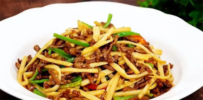 三、洋蔥炒牛肉 食材: 洋蔥、青紅椒、牛肉 制作步驟: 1. 洋蔥切塊,青紅椒切段,牛肉切絲。 2. 牛肉腌制:牛肉切絲后加入生抽、蠔油、糖、小蘇打,攪拌均勻。 3. 制作醬汁:生抽、鹽、糖攪拌均勻。 4. 熱鍋涼油,將腌制好的牛肉炒至變色,盛出備用。 5. 鍋中繼續(xù)加入少量油,加入洋蔥翻炒斷生,再倒入炒好的牛肉,混合均勻。 6. 倒入預(yù)備的醬汁,翻炒均勻即可。 四、脆筍炒牛肉絲 食材: 牛肉、脆筍、青紅椒、生抽、蠔油、鹽、糖、淀粉、小蘇打 制作步驟: 1. 牛肉切絲,脆筍切段,青紅椒切絲。 2. 牛肉腌制:牛肉加入生抽、蠔油、糖、小蘇打,攪拌均勻。 3. 制作醬汁:生抽、鹽、糖攪拌均勻。 4. 熱鍋涼油,將腌制好的牛肉炒至變色,盛出備用。 5. 鍋中繼續(xù)加入適量油,翻炒脆筍,加入青紅椒炒勻,再倒入炒好的牛肉,混合均勻。 6. 倒入預(yù)備的醬汁,翻炒均勻即可。