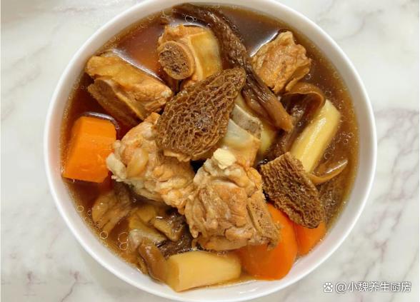 4:將羊肚菌和鹿茸菇放在容器里,加上適量溫水,反復沖洗干凈,剪掉羊肚菌的根部,準備好一些食材,開始烹飪這款胡蘿卜山藥菌菇排骨湯。 5:提前準備好砂鍋一個,湯鍋中放入焯水好的排骨,放入羊肚菌和鹿茸菇,放入胡蘿卜和山藥,多放一些純凈水,然后調到大火燜煮,舀掉表面的浮沫。