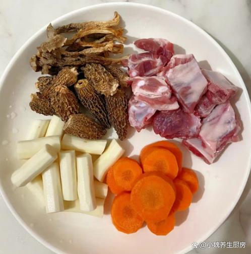 食材清單:選購山藥120克(山藥是一種進補的食材,山藥粉粉糯糯,口感十分清甜,適合用來煲湯喝,滋補養胃,健脾補腎,對身體有益處),胡蘿卜一根,羊肚菌和鹿茸菇少許,溫水少許,冷水和純凈水若干,選購新鮮的排骨500克左右(排骨是我們家每周必吃的食材,不僅僅可以紅燒,用來煲湯也很不錯,湯汁鮮美十足,好喝不油膩,夏秋兩季要多喝排骨湯),黃酒少許,食鹽若干,姜片少許,食鹽若干,其他調味品。www.ws46.com