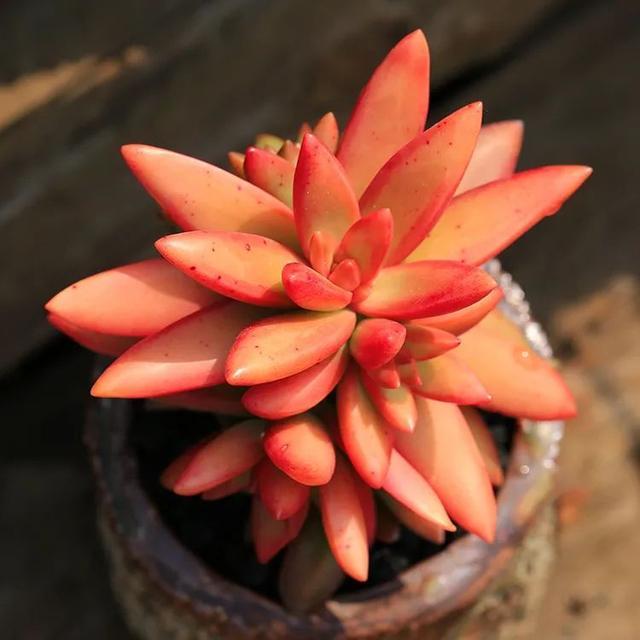 4、紅日 又被稱(chēng)為“加州落日”,這是一種快速變色的多肉植物,顧名思義,這是一種離不開(kāi)陽(yáng)光的植物,如果有足夠的陽(yáng)光, 它們的葉子會(huì)變得和陽(yáng)光一樣,生長(zhǎng)起來(lái)之后,整株植物都是火紅色的,非常的可愛(ài)。