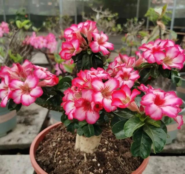 盆栽三角梅不宜選擇過大的花盆,要根據它的主干和冠服來選擇,當然,在養根期間,選擇小花盆更有利于根系的發育,同時也可以有效的控制澆水量,預防澆水過多發生腐爛,還可以控制枝條生長速度,以防出現只長葉不開花的情況。 沙漠玫瑰