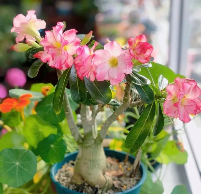沙漠玫瑰是夾竹桃科植物,也叫天寶花,它的枝干上沒有很多葉片,但花朵卻異常妖艷,非常漂亮,像玫瑰一樣,原產地并不在沙漠,卻離沙漠很近,故得此名。 沙漠玫瑰的花期很長一年之中有多季都可以開花花朵顏色比較豐富,比如紅色,粉色,黃色,白色等等花朵十分浪漫,可以營造出一種溫馨的效果。