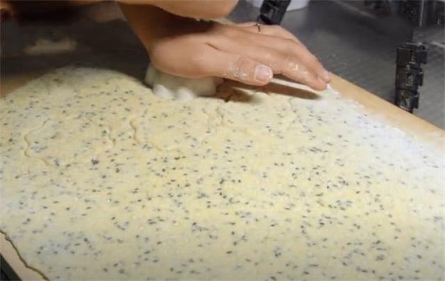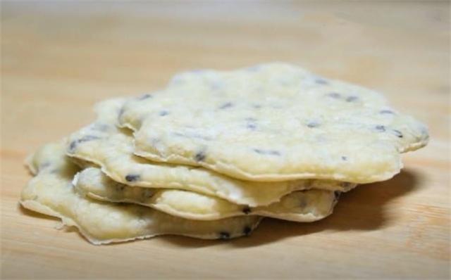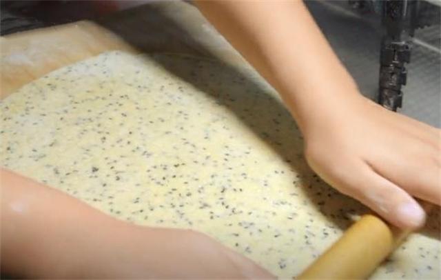 2.在案板上撒入少許面粉,用搟面杖把面團搟成餅皮,這個厚度自己掌握,想要酥脆的就搟薄一點。