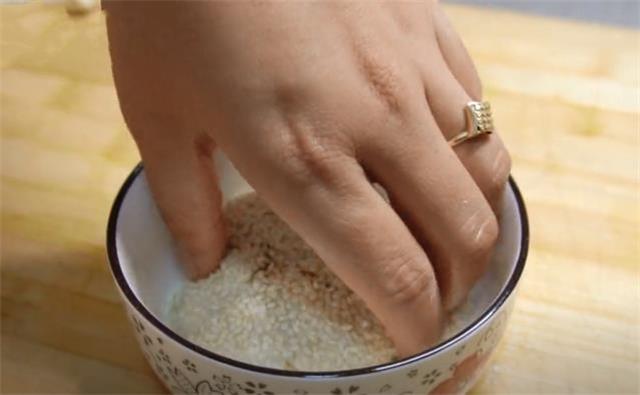 1.容器內放入大約4勺面粉,兩勺酵母粉,兩勺無鋁泡打粉,用溫水和面,水要一點一點的加,等到沒有干面粉的時候,把面粉揉搓成面團,做麻醬燒餅的面團一定要是粘手又軟的面團才好吃,這樣餅不會發硬,蓋上保鮮膜餳發半個小時。