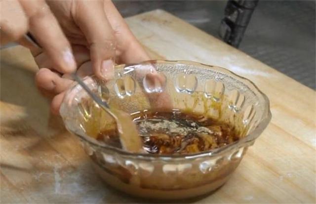 2.趁餳面的功夫,我們調一下麻醬汁,取適量麻醬,放入香油、花椒粉、少許老抽,食鹽,攪拌均勻。