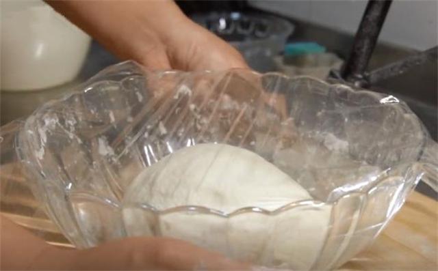 3.現在面餳好了,案板上撒少許面粉或者食用油,把餳發好的面團揉搓至原來的大小,排出里面的空氣,按壓成餅的形狀,然后用搟面杖搟成餅皮。