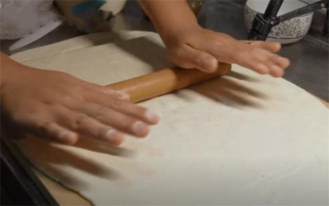 5.對折后再次搟成餅皮,用勺子或者刷子把調好的麻醬汁均勻的涂抹上,從末端向前一點一點的卷起來。