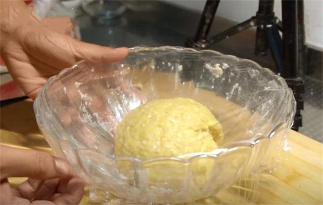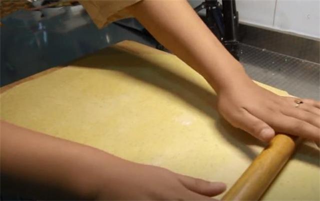 2.現在40分鐘過去了,案板上撒入少許面粉,把面團揉搓均勻,壓成餅的形狀,然后再用搟面杖搟成餅皮,越薄越好就越脆。