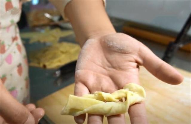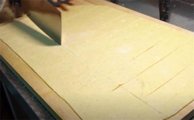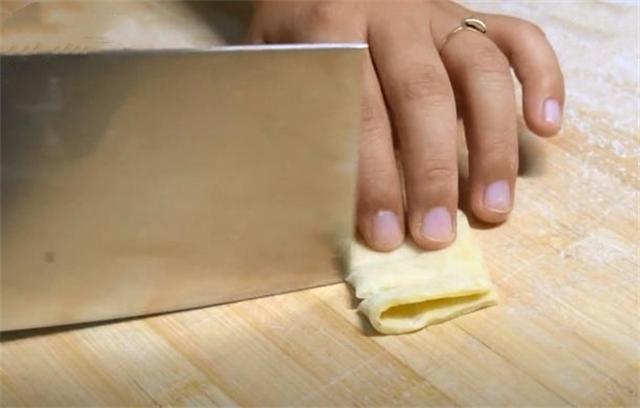 3.用刀把餅皮切成長條,然后再橫著切成長條。