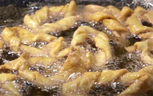 7.鍋內倒入適量食用油,干凈的筷子插進去,有小氣泡的時候把麻葉放鍋里炸,炸至飄起兩面金黃后就可以了。