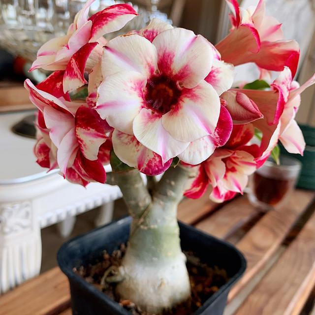 3、沙漠玫瑰沙漠玫瑰是一種非常好的居家盆栽,我曾經養了許多盆,可是卻沒有一盆能夠在冬天存活下來。 沙漠玫瑰種類繁多,花色艷麗,花期持久,如果照顧好,一年四季都可以欣賞。 要想讓它長得好看,就得先把它裝在一個小盆里。 這樣的一株植物,只要有一點土壤,完全不用擔心會被雨水淋濕,腐爛。 沙漠玫瑰,只要給它足夠的肥料,它的長勢會非常好,但要想開花,就得多施點磷肥和鉀肥,但也要注意量。在開花期間,花多多二號每隔十天噴灑一次。