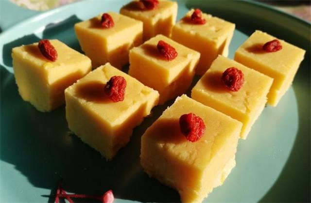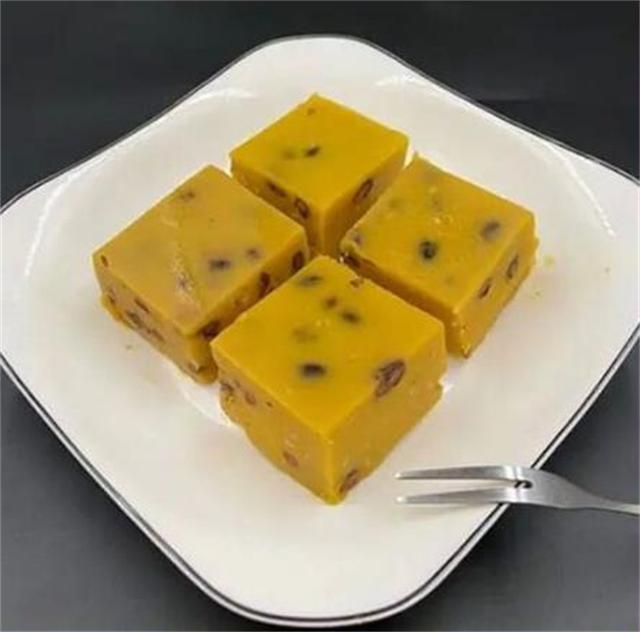 取出蒸好的豌豆糕,等其稍微冷卻后,用刀將其切成小塊,即可食用。豌豆糕的顏色鮮艷誘人,口感清新爽口,非常適合作為小零食或者甜點食用。