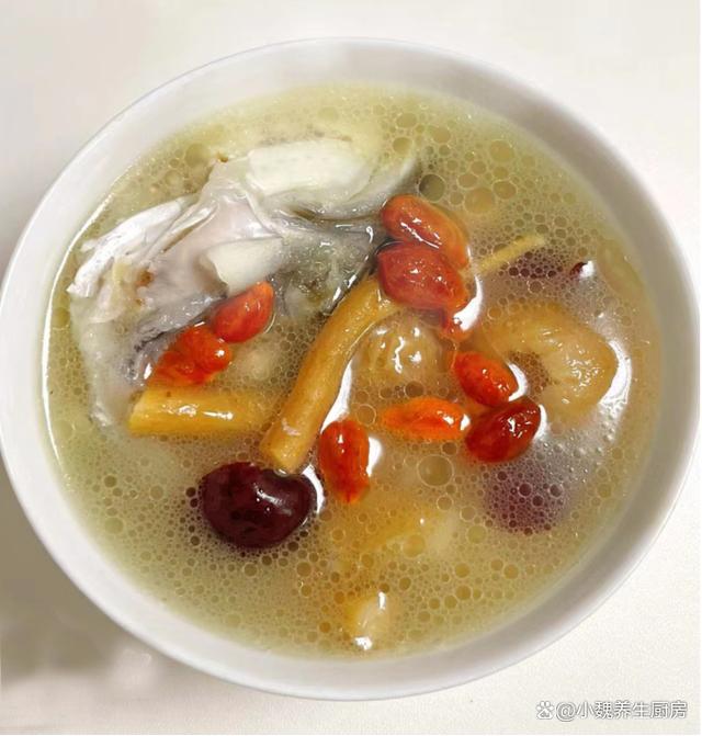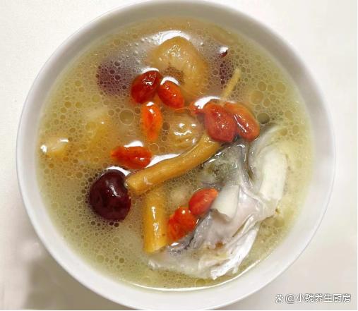 第六步:最后放入一些枸杞子,加上少許食鹽,味極鮮,胡椒粉,燜煮一小會兒,出鍋,這款黨參紅棗魚頭湯就制作完成了。