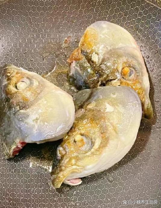 第三步:提前把鍋底燒熱,鍋中加上適量植物油,撒上少許食鹽,將魚頭下鍋煎至金黃,盛出備用。