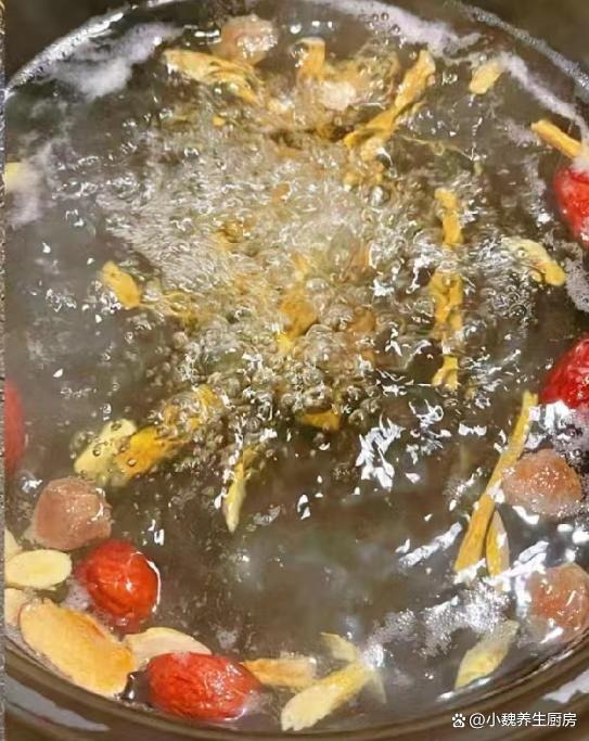 第四步:準備好一個湯鍋,鍋中放入黨參,黃芪,紅棗,桂圓和姜片,加上適量清水,湯汁大火燉20分鐘。