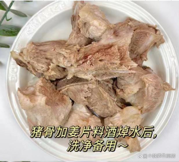 4:提前讓商販把豬骨剁成塊,豬骨塊放入湯鍋中,加上少許料酒,放入一些姜片,記得要冷水下鍋焯水,煮幾分鐘撈出,沖洗掉浮沫備用。