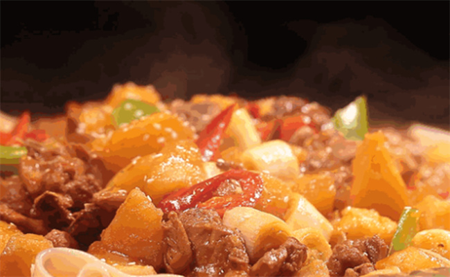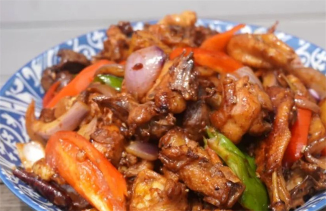 3、在這樣的背景下,新疆大盤雞應(yīng)運(yùn)而生 大盤雞起源于誤打誤撞,經(jīng)過多次演變,成為葷素搭配的養(yǎng)生美食。新疆大盤雞的主要食材包括童子雞、洋蔥、土豆、干辣椒、蒜、姜、料酒、小茴香、啤酒、青紅椒等。制作過程中,先將土豆烤熟,然后用童子雞炒制,加入各種調(diào)味料,最后加入烤好的土豆和洋蔥,滾刀切塊的青紅椒,形成了葷素搭配的豐富大盤雞。