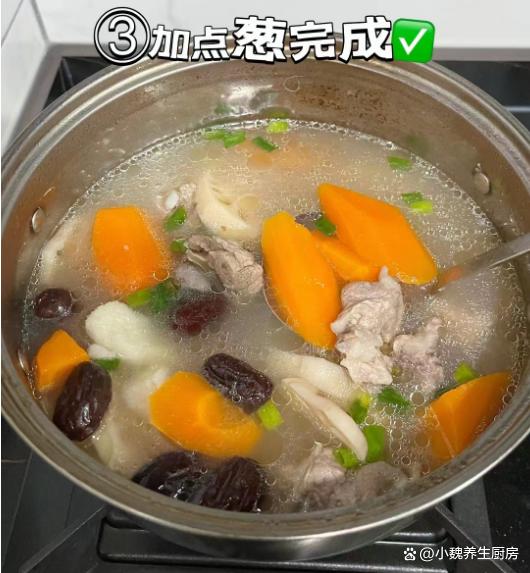 6:讓食材都煮至軟爛,湯汁慢慢變色,滴入一些香油或食用油,放入食鹽,胡椒粉,放入一些小蔥花即可,這款山藥胡蘿卜蓮藕燉豬骨就可以享用了。