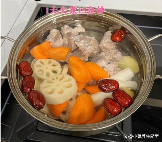 4:準(zhǔn)備好一個燉湯的湯鍋,鍋中放入豬骨,依次放入蓮藕,胡蘿卜,紅棗,姜片,蔥段和山藥,加上足夠的純凈水,一定要沒過全部食材,不要中途加水。 5:燉湯一定要掌握好火候,先大火燉煮,然后轉(zhuǎn)小火慢燉,大概要燉一個半小時左右。