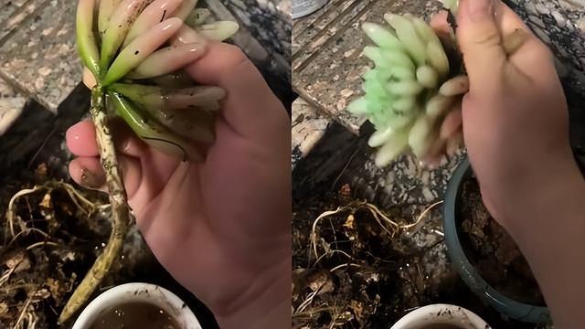 這是什么情況? 結果,這盆多肉在小丫頭的幫助下,長得很好,一點都不像是剛剛過完夏季的樣子。 少女得意洋洋的夸獎著自己的種植技術,然后輕輕的將多肉植物的根莖拔了出來,露出了它的根莖。 少女摸了摸,硬邦邦的,顏色也不太對,是棕色的。小女孩將信將疑的用水洗了洗,然后就看到了真相。